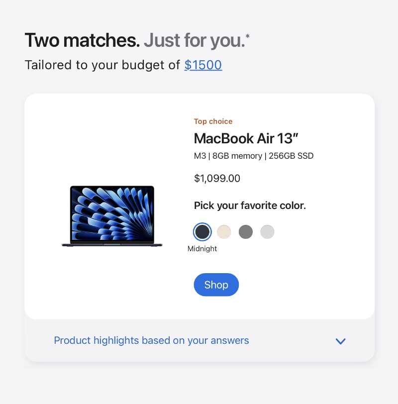 Apart from the recommendation, Apple may upsell you a Mac with higher specs, such as a MacBook Air with a larger display. But, it will usually do so in or around the budget you currently have. Interestingly, I entered the things I usually do on my Mac on a daily basis and it recommended me the M3 MacBook Air with 8GB of RAM and 256GB of storage (above) which is interestingly the notebook I’m currently using.