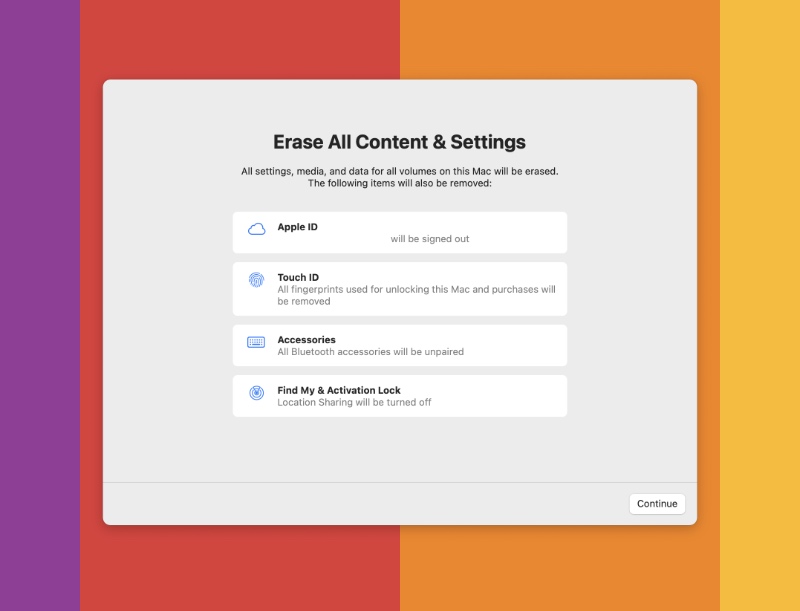 Step 7. Read the on-screen information and then click on Continue on the bottom right. Follow through and your Mac will be erase and reset.