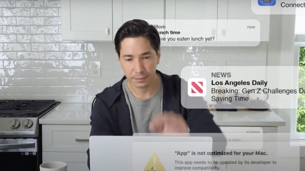The ad starts off with Justin being bombarded with notifications and pop-ups. I’ll talk about a couple of them, such as app compatibility issues and running out of storage space. These issues are common across the board and not unique in any way.