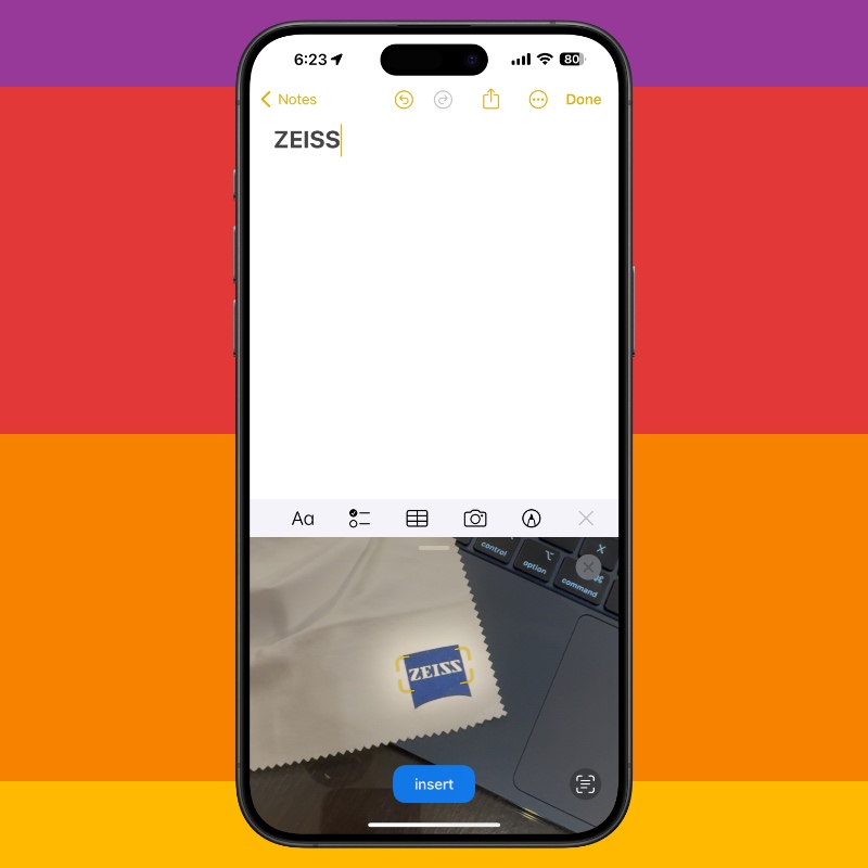 Step 5. Your keyboard is now a camera viewfinder. Now point it towards the text you want to scan and you’ll immediately see a preview of it in the note above. If that’s what you want, tap on ‘Insert’ below the viewfinder.