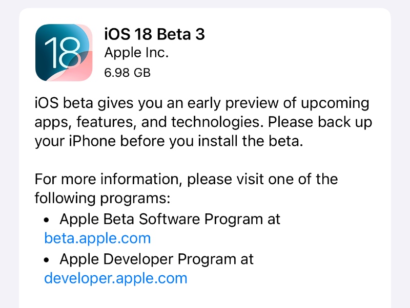 Apple has released beta 3 of iOS 18 and iPadOS 18 for iPhone and iPad, respectively. This update is available over the air for developers.