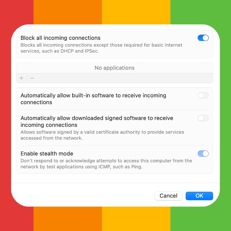 Whenever you’re using a public Wi-Fi network, you can turn the firewall on and block all incoming traffic to your Mac. Once you’re back home or at a trusted location, you can just turn the firewall back off, if you want.