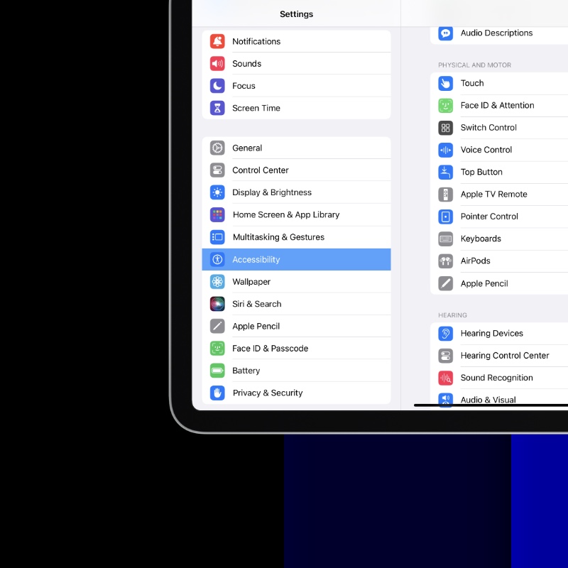 Step 2. Find ‘Accessibility’ from the list of options on the left. You may have to scroll down a little for this. Once found, tap on it to open.