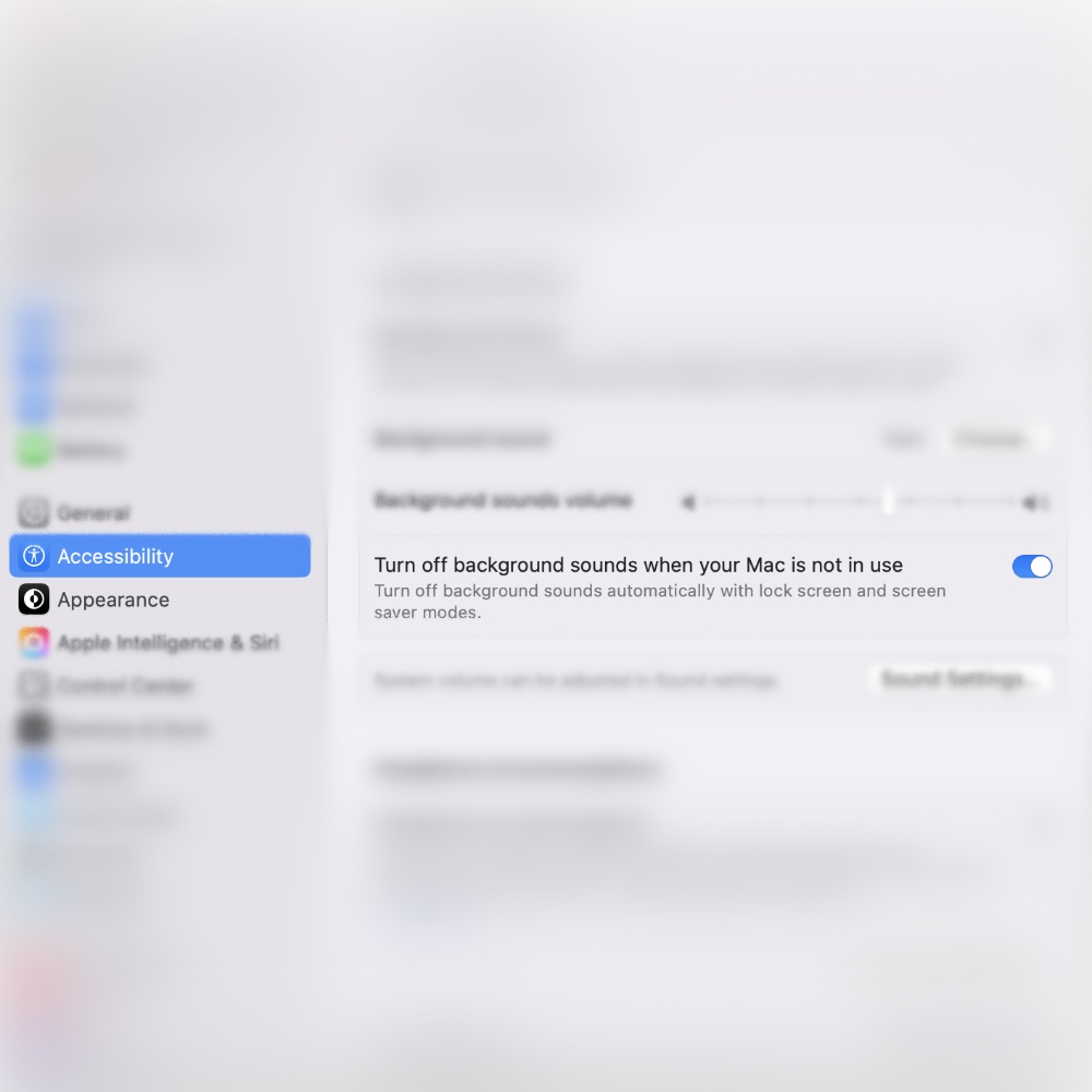 You can access and view this feature in Accessibility by going to System Settings > Accessibility > Audio > Background Sounds. Once here, you’ll see an option that turns off Background Sounds when your Mac is at the Lock Screen or in Scree Saver mode.
