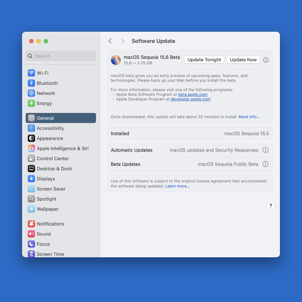 In order to download macOS 15.6 Sequoia public beta on your Mac, you have to sign up to the beta.apple.com website. Once done, launch System Settings, click on General, go to Software Update > Beta Updates.
