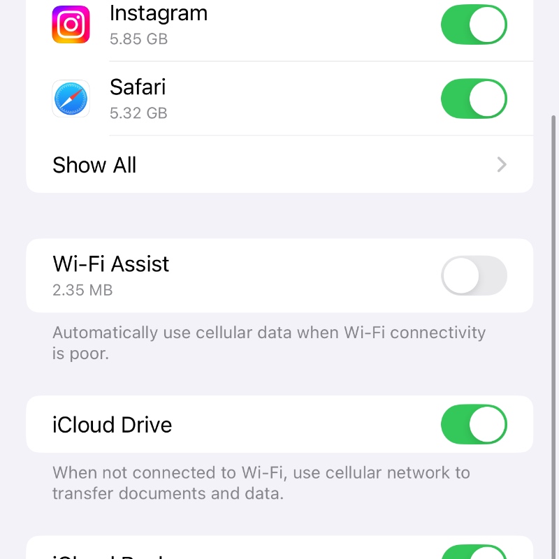 Step 3. Scroll down and find the Wi-Fi Assist toggle switch and turn it off.