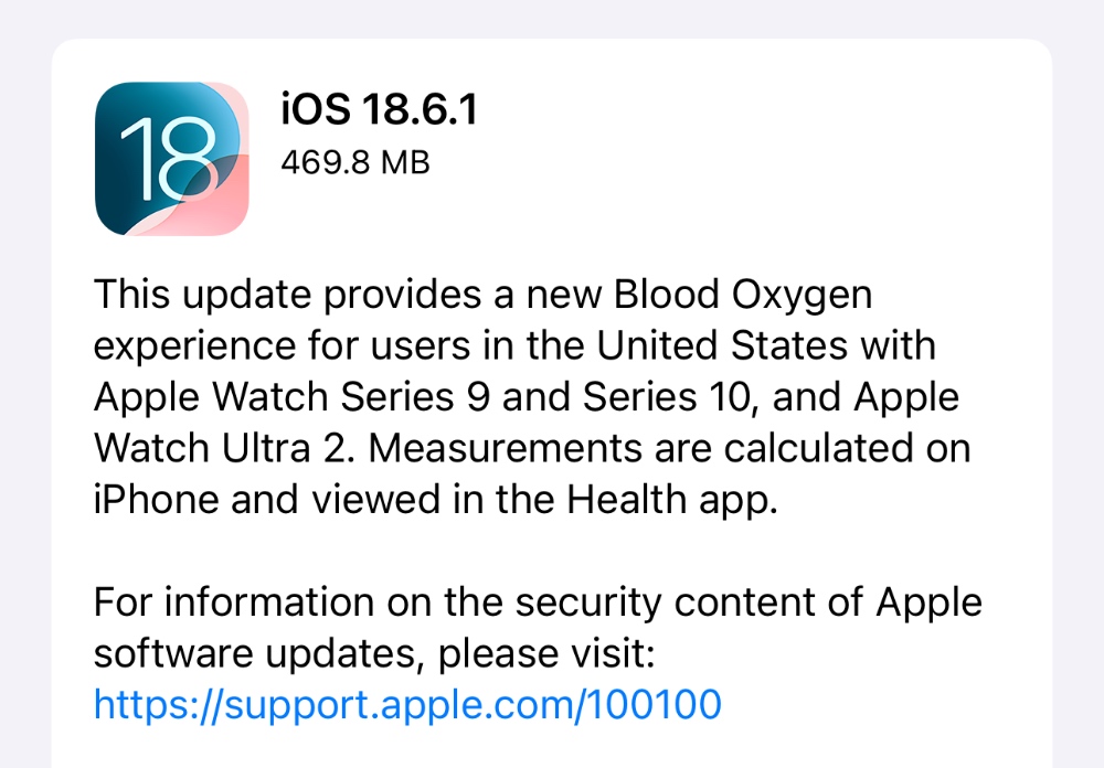 Apple has released the new iOS 18.6.1 update for iPhone which enables Blood Oxygen on Apple Watch in the United States – download it today..
