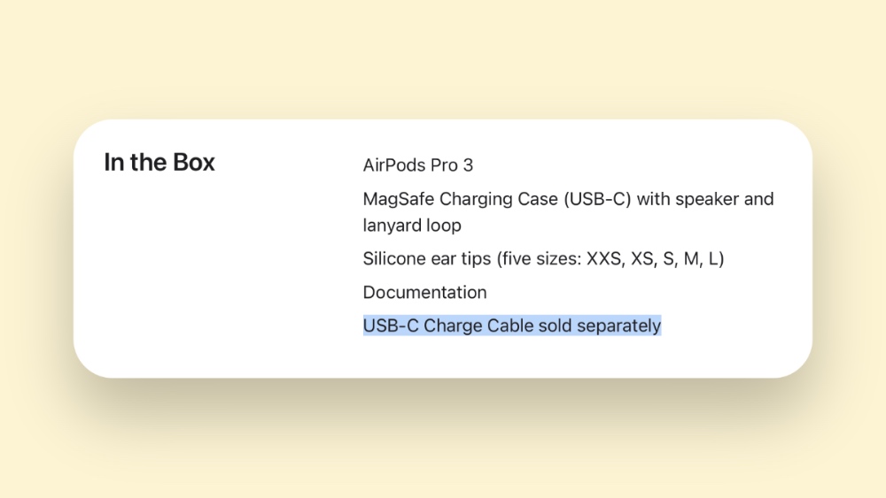 With AirPods Pro 3, Apple is assuming that everyone has a USB-C cable already, so you don’t get a charging cable at all. You have to purchase it separately.