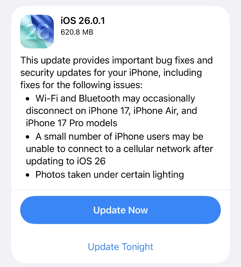 As expected, Apple has released iOS 26.0.1 and iPadOS 26.0.1 updates for iPhone and iPad. It comes with a bunch of bug fixes and even patches an issues for iPhone 17 users where Apple Intelligence may become unusable.