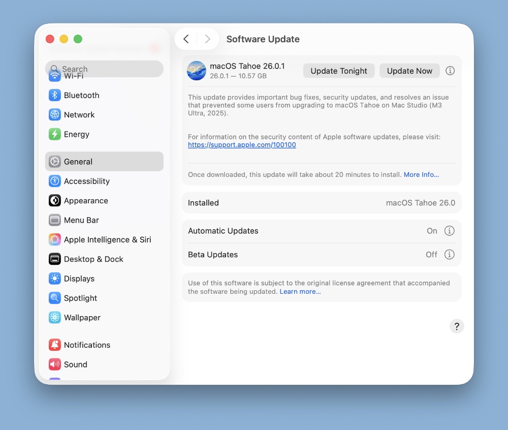 This update provides important bug fixes, security updates, and resolves an issue that prevented some users from upgrading to macOS Tahoe on Mac Studio (M3 Ultra, 2025).
