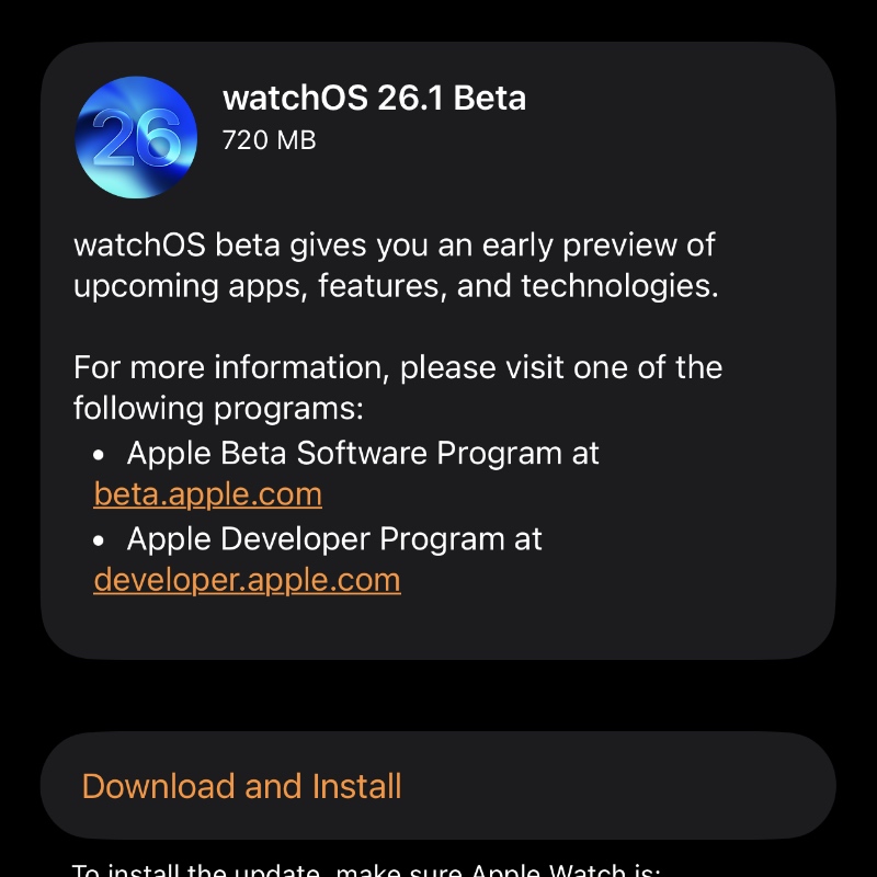 Once that is done, you’ll see watchOS 26.1 developer beta 1 in Software Update. Tap on Download and Install, and the update will begin to download in a few seconds.