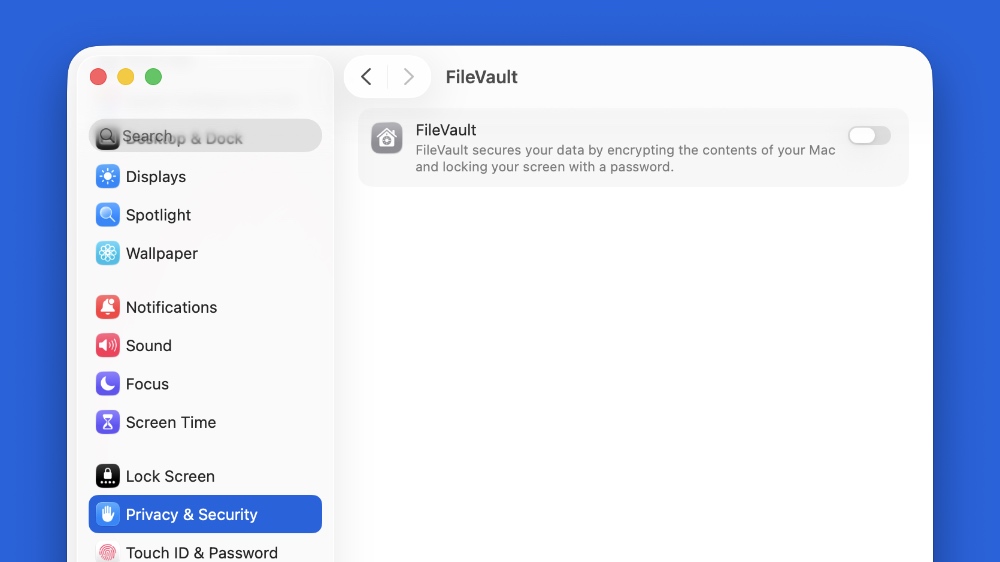 In order to do that, launch System Settings on your Mac, scroll down to Privacy & Security, and then select FileVault from the list of options on the right. Now simply disable FileVault.