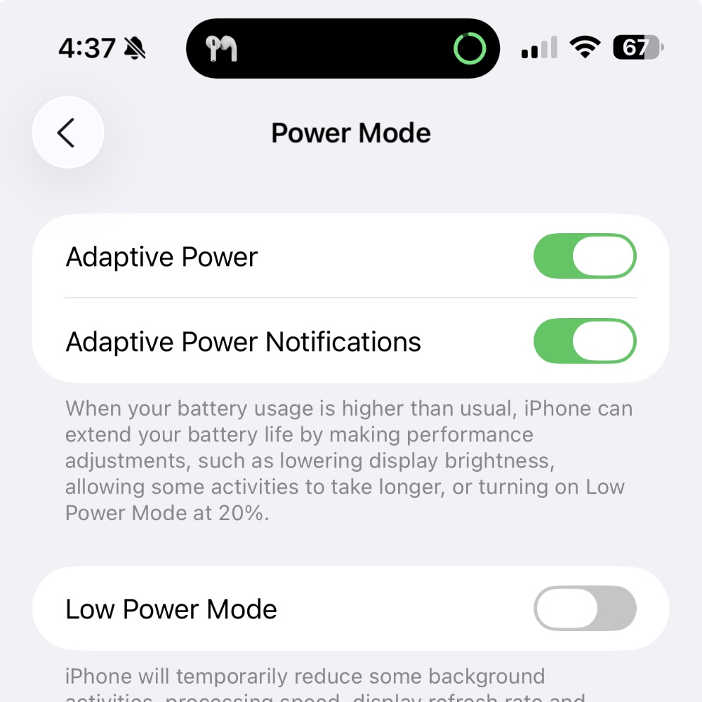 The moment I installed iOS 26, I enabled Adaptive Power, because it’s a key feature. In fact, it’s turned on by default on iPhone Air and iPhone 17, so it better be doing something, right?