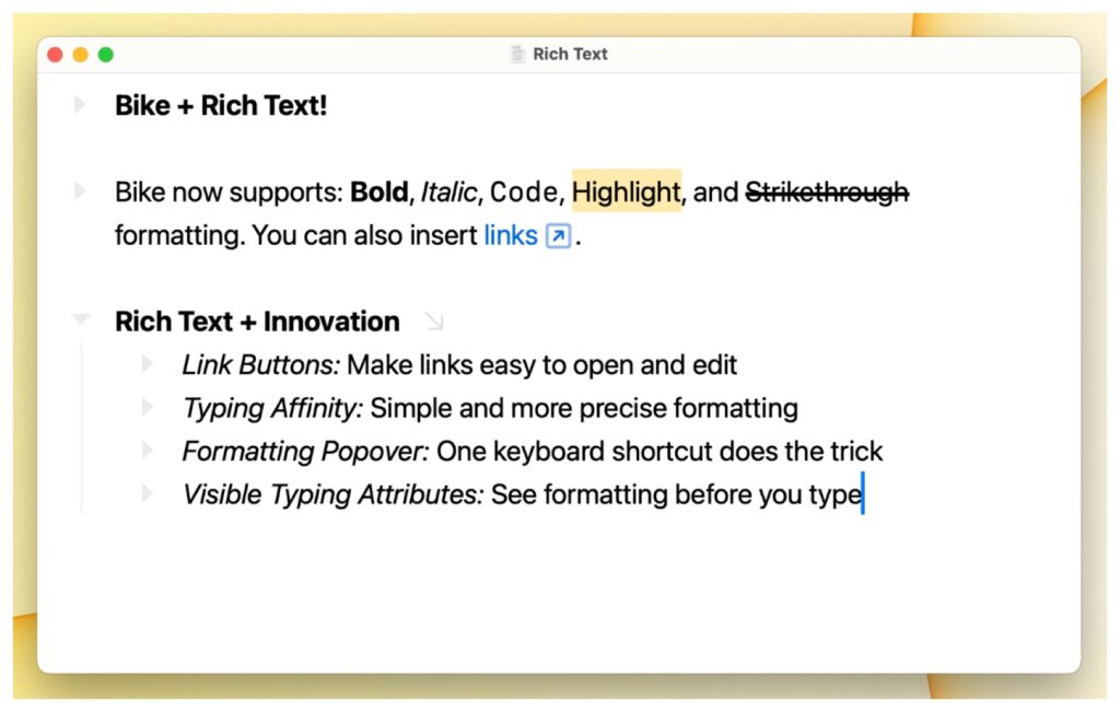 Jot down your thoughts in rich text format using Bike Outliner. Since it’s super easy on resources, you can have it running next to your productivity session forever.